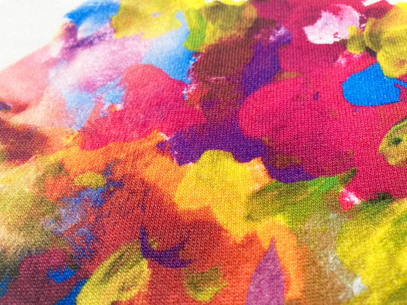 インクジェットでプリントされた転写フィルムを生地に熱プレスで転写。ヨーロッパを中心に2020年頃から注目されるようになった新しいプリント方法です。